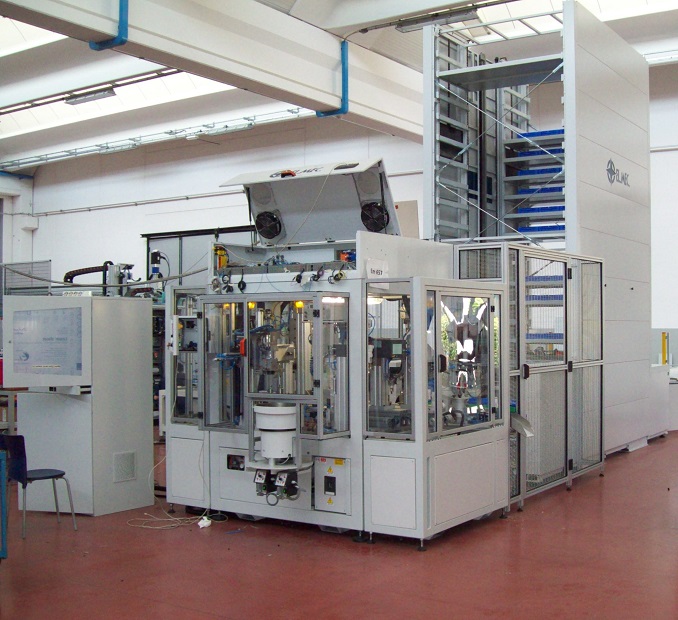 La macchina lavora in modo completamente automatico, l’operatore ha il compito di caricare i blister con i componenti all’interno del magazzino verticale, un robot effettua il carico dei pezzi in macchina.